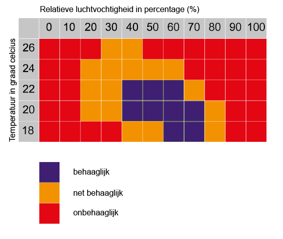 - De meeste mensen ervaren een RV tussen de 40 % en 60 % als behaaglijk. Dit is mede afhankelijk van de temperatuur (zie ook onderstaande tabel).