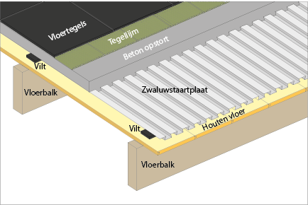 Een vloer kan worden voorzien van zwaluwstaartplaten met een laagje beton. Zwaluwstaartplaten zijn metalen platen met een zwalustaartprofiel (zie afbeelding 1). Daarover kan dan vervolgens de vloerverwarming gelegd worden, waarna deze wordt afgewerkt met een betonlaag. Daarop kunnen dan bijvoorbeeld de tegels gelegd worden.