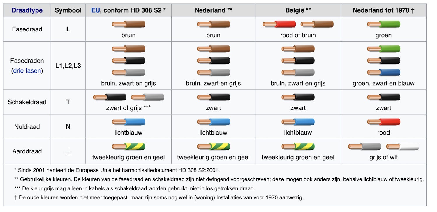 De kleuren van de bedrading zijn in de NEN 1010 voorgeschreven.