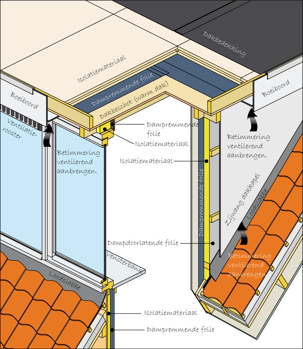 Aan de binnenzijde van geïsoleerde bouwdelen, zoals het dak en de zijwangen, moet een dampremmende laag zijn geplaatst. Dit voorkomt vochtophoping in de constructie.