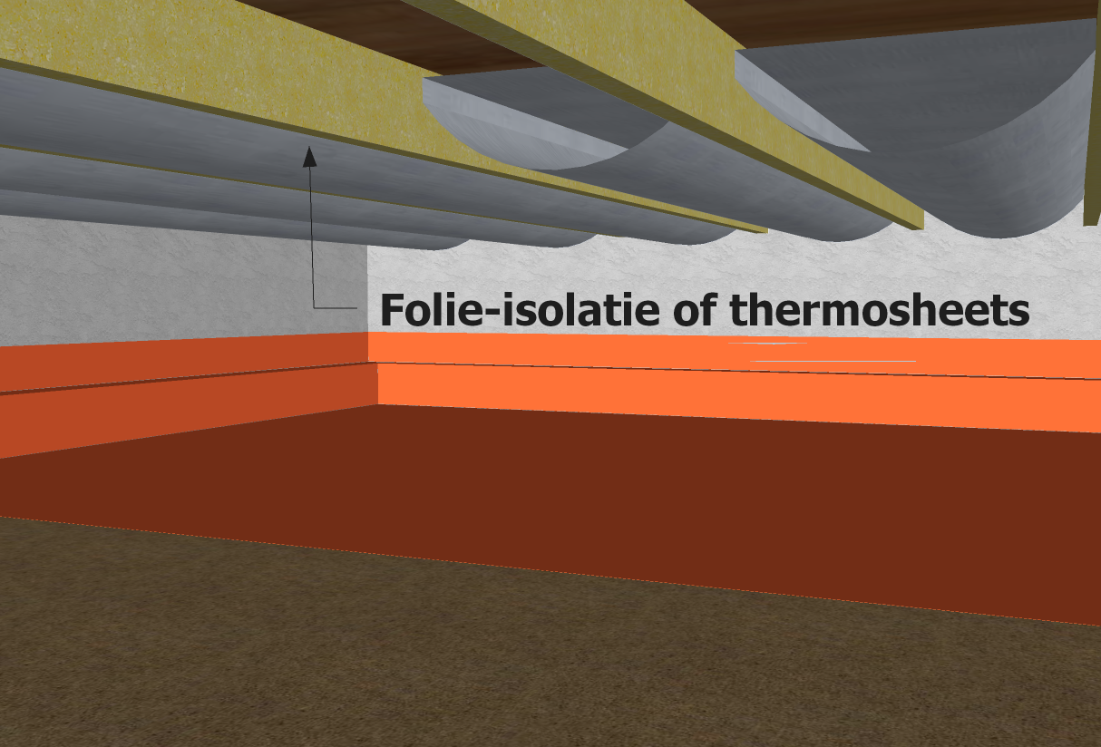 Bij deze methode wordt warmte-reflecterende folie in zakken onder de vloer aangebracht. De zakken zijn luchtdicht afgesloten waardoor tussen de lagen stilstaande lucht ontstaat. Daarnaast reflecteert een deel van de warmte die door de vloer komt terug. Het aanbrengen van deze foliezakken is rondom leidingdoorvoeren niet eenvoudig, omdat de foliezakken in stroken moeten worden aangebracht. Onder houten vloeren worden de zakken vastgeniet aan de vloerbalken. Bij steenachtige of betonnen vloeren worden ze bevestigd met pluggen. - Los gespoten PUR-schuim